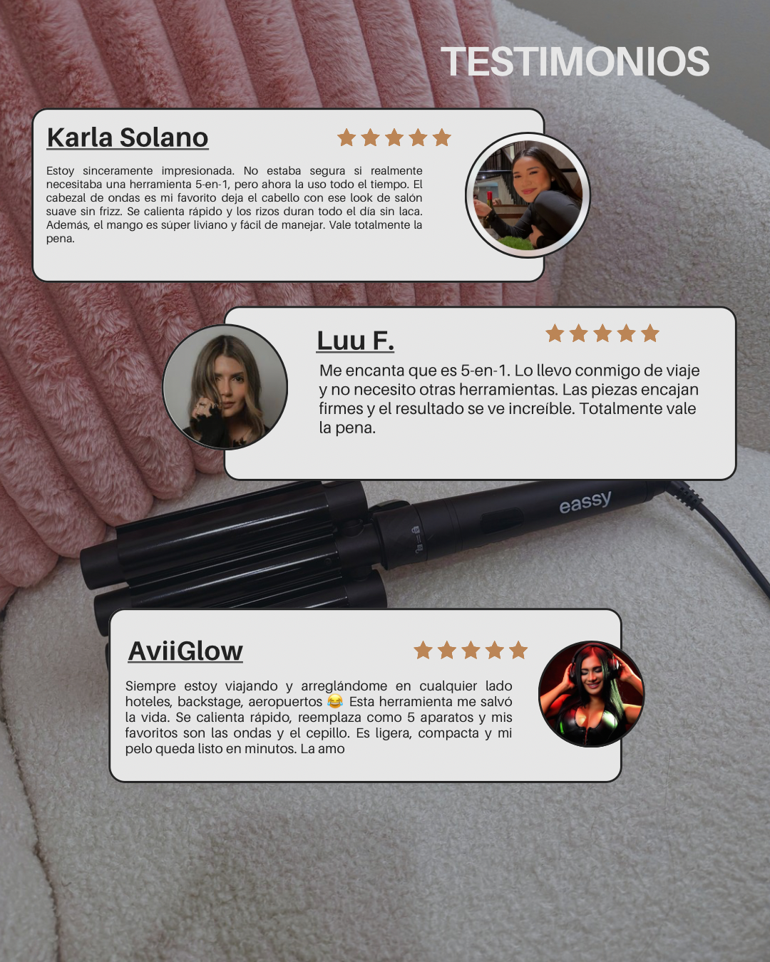 Este sistema incluye cinco cabezales intercambiables que te permiten crear distintos looks con una sola herramienta: ondas suaves, rizos definidos, volumen, textura o un acabado liso y pulido.